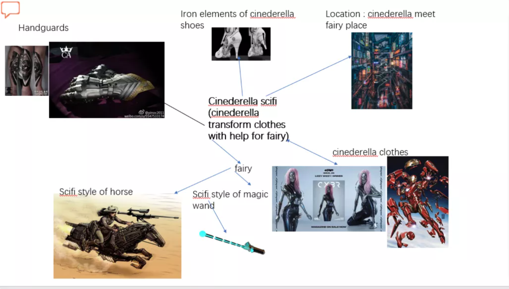 I was paired up with another boy in a group discussion, and we finally decided on the SciFI-style Cinderella.I’m working on Cinderella’s outfit, which is scifi style, which is supposed to be more metal, sci-fi, tough stuff. I reference the manga <iron man> whch use lots of elements of armor and machinery. I discussed with my team that the fairy who gave Cinderella the clothes should be an engineer, but I still kept the wand element, In the original story, Cinderella, with the help of the fairy, went to the castle with a pumpkin made carriage. But I think that the horse in the sacifi world view should not be like this. It should have more dark wind. I chose black as the main color of the horse.